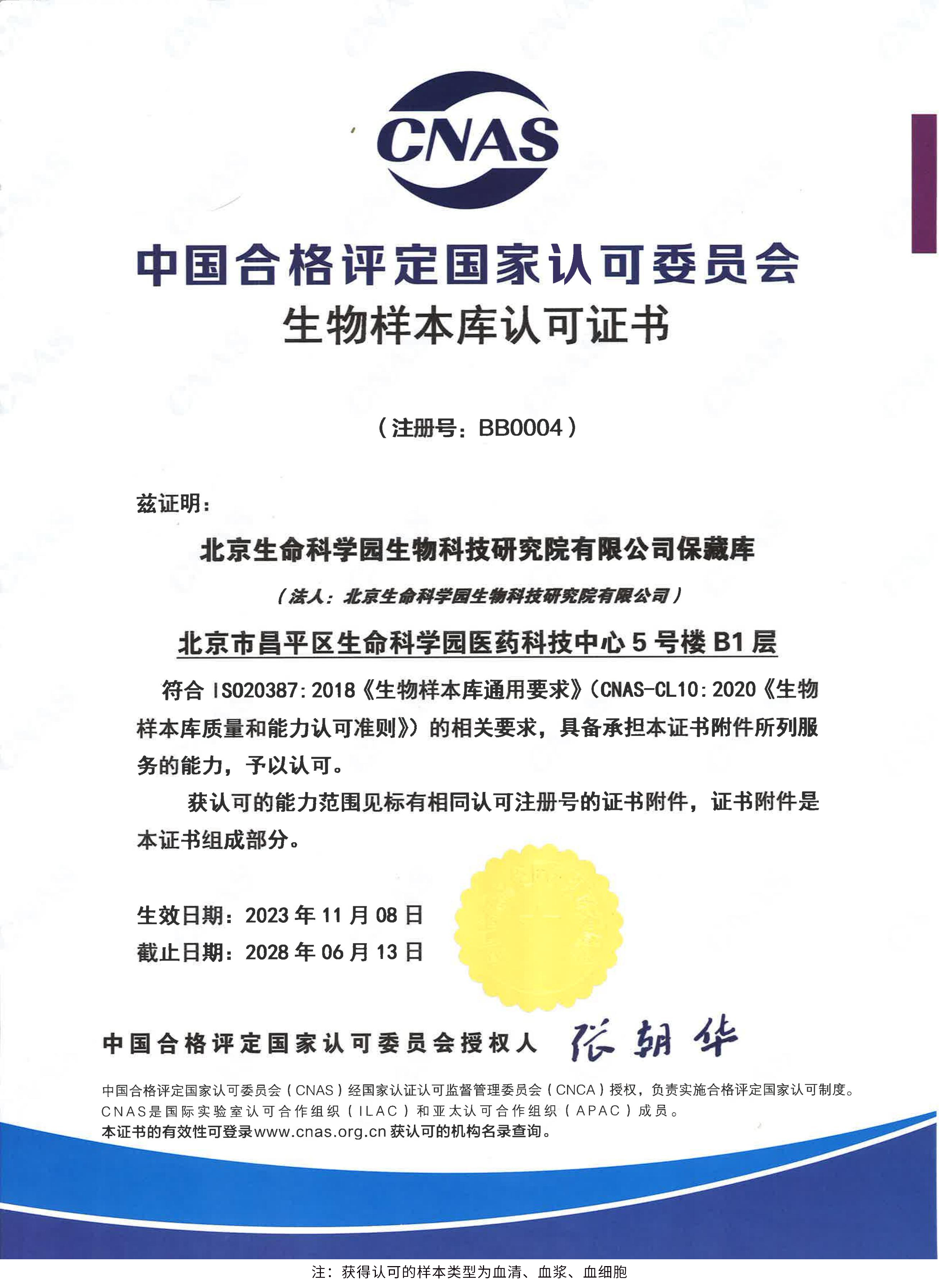北京生命科學(xué)園生物科技研究院(以下簡稱“北京生物樣本資源庫”)(Biobank of Life Science Park,簡寫“BoLSP”)是一家由北京市科委和中關(guān)村生命科學(xué)園共同支持設(shè)立的第三方生物樣本庫公共服務(wù)平臺(tái),秉承北京重大疾病臨床數(shù)據(jù)和樣本資源庫(以下簡稱“北京庫”)(Beijing Biobank of Clinical Resources,BBCR)十余年的發(fā)展成果,聚合眾多臨床樣本專家的專業(yè)共識,致力于在生命科學(xué)、生物醫(yī)藥研究領(lǐng)域發(fā)揮銜接樣本資源持有者與研究者的橋梁作用,解決生物樣本資源開發(fā)上下游信息不對稱、資源共享困難等問題。研究院在北京中關(guān)村生命科學(xué)園昌平園區(qū)建立了2000㎡生物樣本庫,最大存儲(chǔ)規(guī)模達(dá)1000萬份。研究院遵循CNAS-CL10:2020《生物樣本庫質(zhì)量和能力認(rèn)可準(zhǔn)則》,同時(shí)結(jié)合北京庫過去十年的工作經(jīng)驗(yàn)與教訓(xùn),建立了一套完善的生物樣本保藏質(zhì)量管理體系,從人、機(jī)、料、法、環(huán)、控多個(gè)角度,實(shí)現(xiàn)生物樣本保藏過程的全面質(zhì)量控制,先后獲得國家科技部頒發(fā)的人類遺傳資源保藏行政許可證書和中國合格評定國家認(rèn)可委員會(huì)(China National Accreditation Service for Conformity Assessment,CNAS)頒發(fā)的“CNAS認(rèn)可證書”。